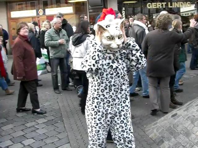 ドイツというと猫よりも犬様の世界を想像する方が多いと思います。ドイツの人口は8千万人、一説によると飼い犬の数は530万匹、猫はこれに勝る780万匹、何とペットで飼われている動物で猫はドイツ一なのです。780万匹のなかで一番大きなのがこの猫だと思われます。私はこの猫をドイツはニュルンベルクのクリスマスマーケットで発見しました。耳に両手をあて、さも「聞きたくな〜い」といったポーズに見えますが、それは大きな勘違い。この子は今まさに人間から猫のパフォーマーに変身し、かぶり物の位置を両手で安定させようとしているところなのです。それにしても猫への変身は皆のいない物陰ですればいいものを、町の真ん中で人に見られても平気のへっちゃらで猫に化けていました。大胆ですね、ドイツの猫は。