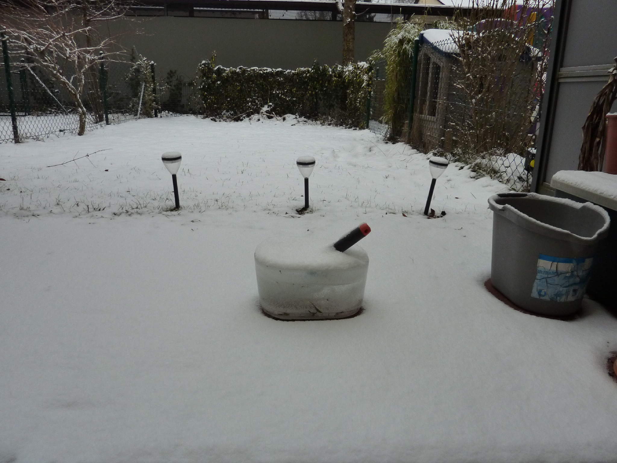 植木鉢で作っていたリスのためのテーブルも、雪がすっぽりとかぶってしまいました。